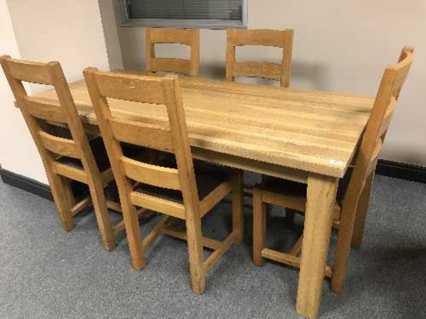 A rectangular oak table and five ladder back chairs