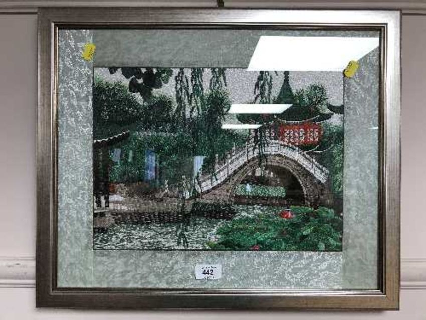 A pair of silk pictures depicting Chinese figures, together with three further silk pictures depicting Oriental scenes
