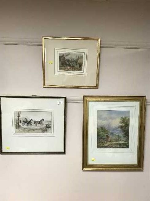 A D Peppercorn : Farm yard, watercolour, together with a watercolour depicting a country track and a charcoal drawing of a horse and carriage. (3)