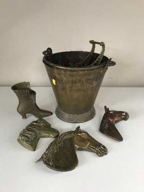A brass coal bucket containing brass horse head figures, brass cannon etc
