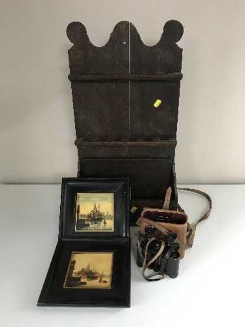 A nineteenth century oak spoon rack together with pair of binoculars and two pictures on ivorex