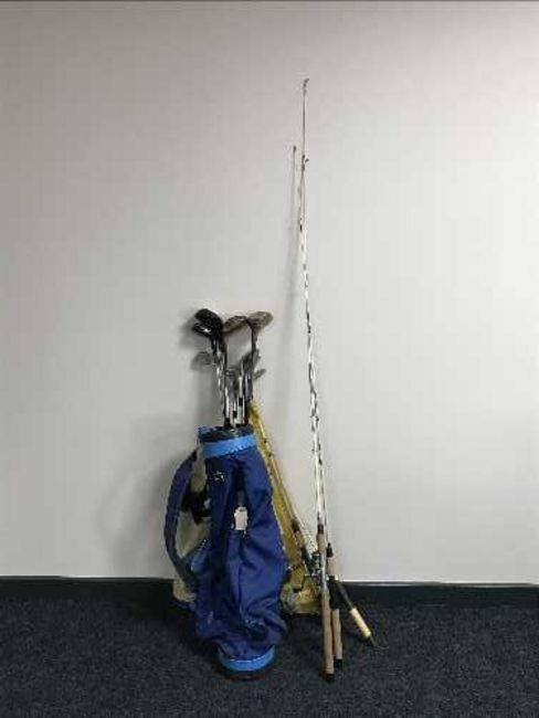 A golf bag with clubs together with fishing rods
