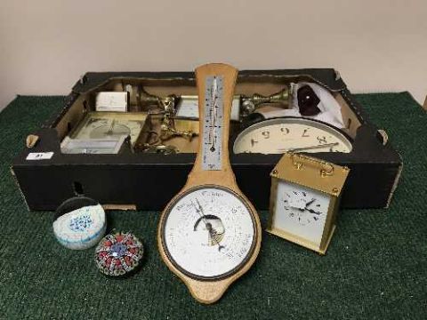 A box of clocks, carriage clocks, two glass paperweights, etc