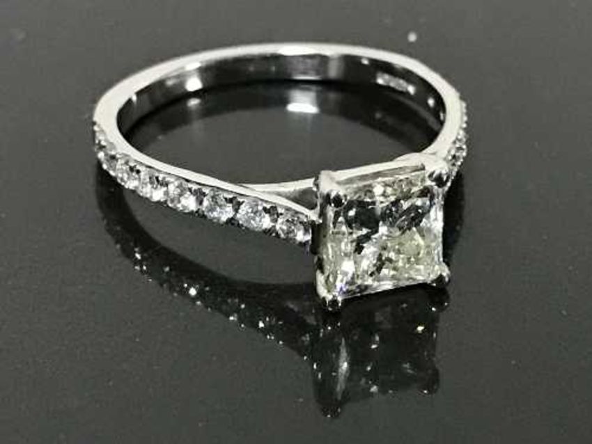 A princess cut diamond solitaire ring 1ct set in platinum, colour G/H, clarity Vvs, currently insured for £10,000, certification available.