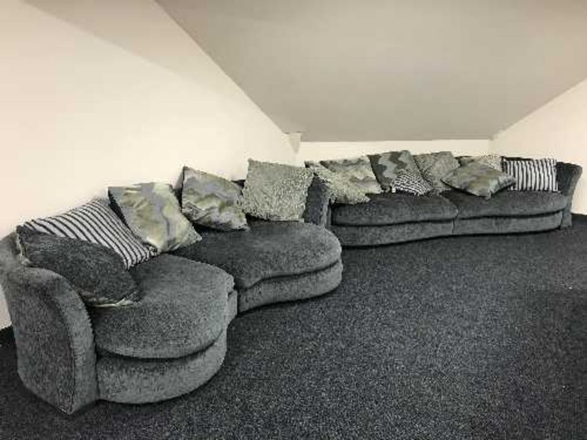 Two contemporary large settees with scatter cushions in grey fabric