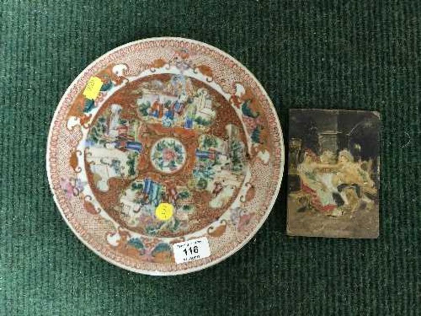 A Chinese cabinet plate and a hand painted wooden panel depicting Persian figures