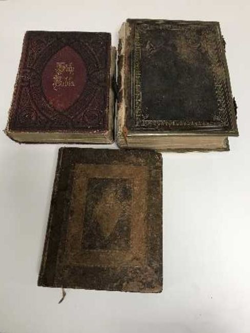 A box of Victorian holy bible, Birkets Testament etc