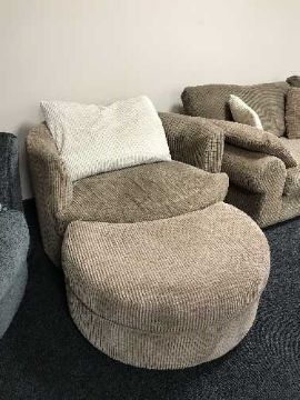 A pair of three seater settees, circular footstool, chair and scatter cushions