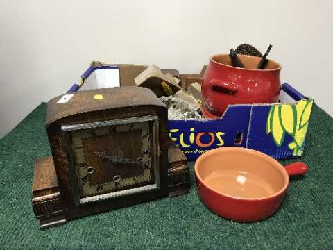 Two boxes of oak mantel clock, storage box, cutlery, wooden bowls etc