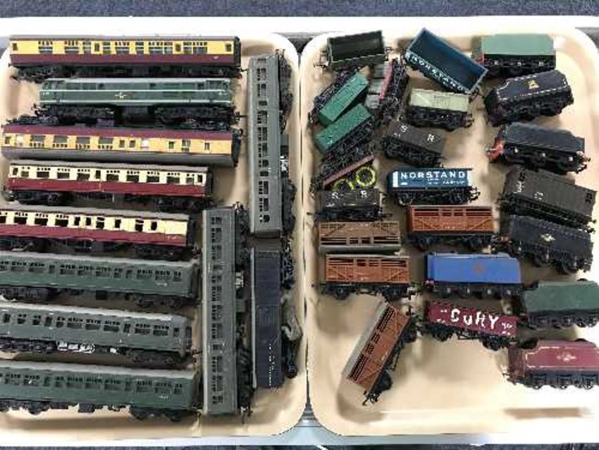A good collection of OO gauge locomotive engines, rolling stock, carriages and track by Hornby, Triang, etc