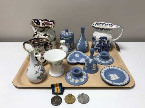 A tray of Masons jug, Wedgwood ornaments, two WW1 Medals