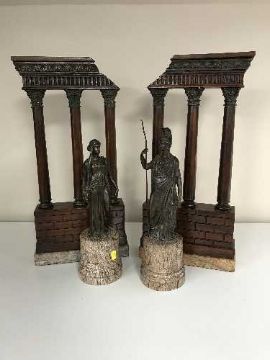 A pair of bronze classical style statues on marble bases and a pair of mahogany ormolu mounted columns on marble plinths (4)
