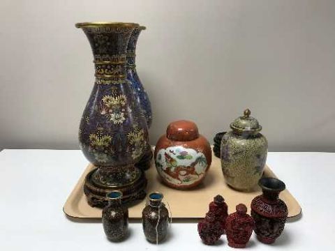A pair of cliosonne vases, ginger jar, wooden stands, scent bottles etc