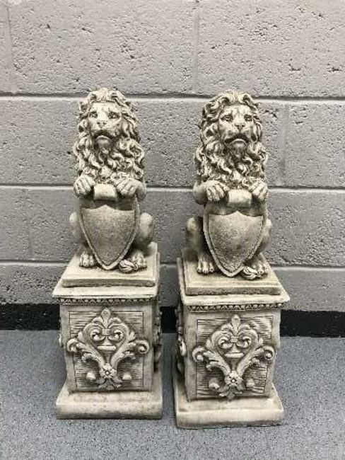 A garden figure - pair of lions on plinths