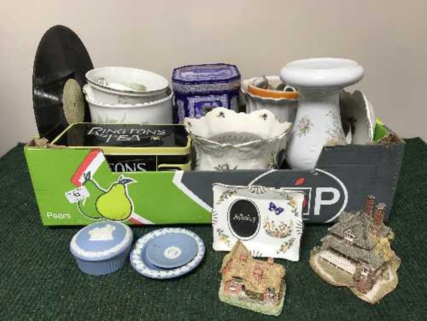 A box of Ringtons ware tins, cottages, blue and white pot etc