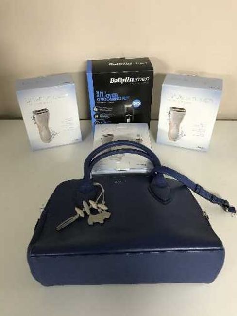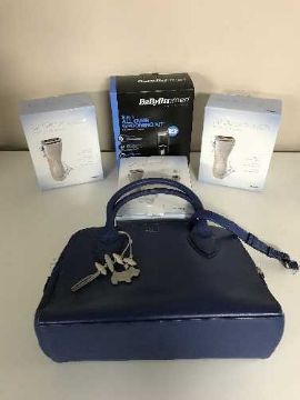 A box of Radley handbag, Babyliss men's grooming kit, three True Smooth shavers and a jewellery box