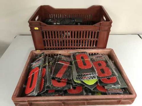 A crate of pet collars, stickers, car battery, compressors