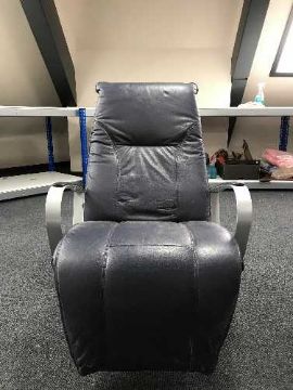 A blue leather metal framed swivel armchair