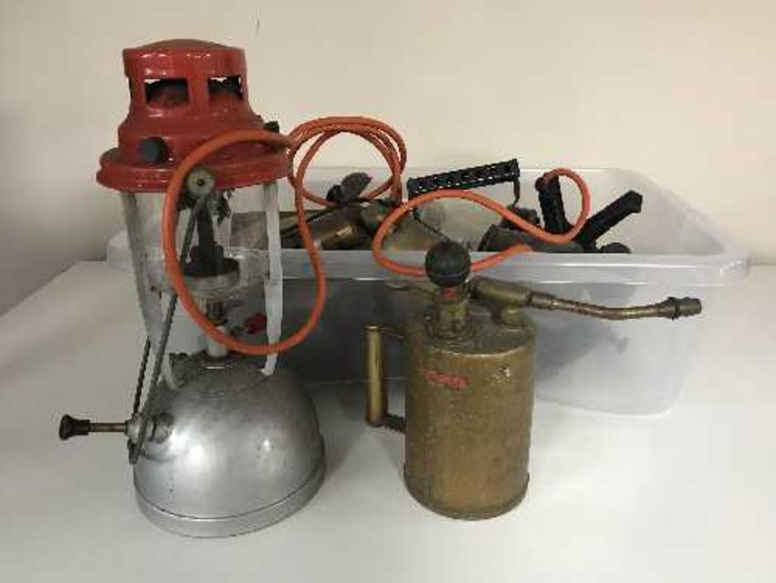 A box of vintage blow torches, wood working planes, Tilley lamp etc