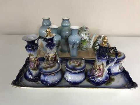 A tray of four Shelley vases depicting boats, eight piece china trinket set, oriental teapot and lidded sugar basin