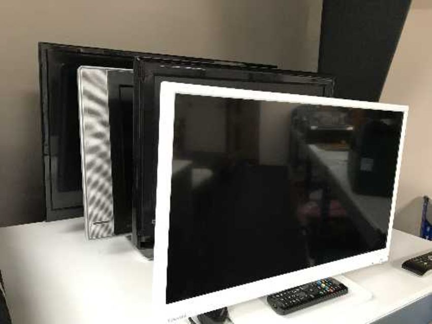 A Toshiba 24 inch LCD TV with remote and three other LCD TVs