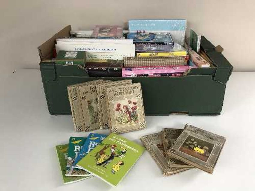 A box of assorted books, set of seven Flower Fairies books, postcards, PC Roms etc