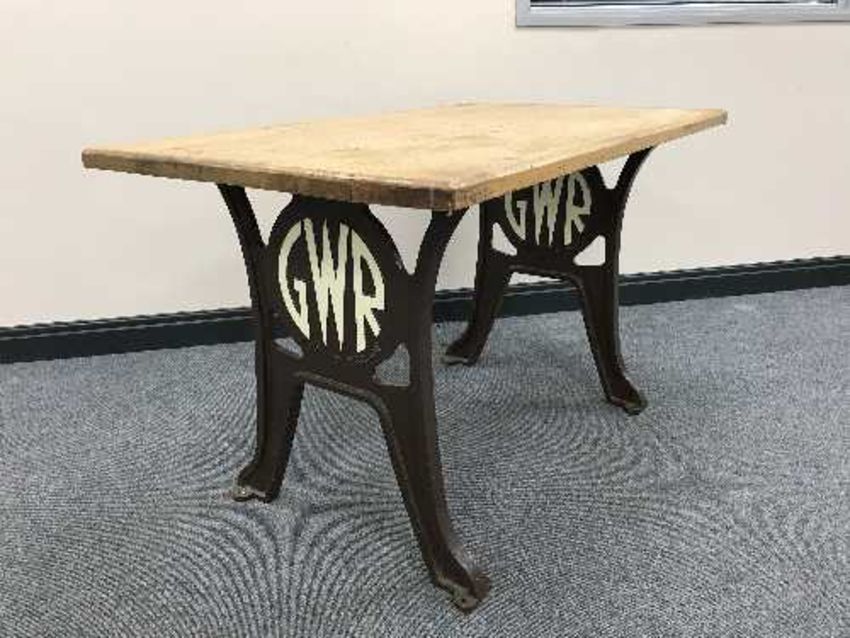 An oak topped kitchen centre table on cast iron legs bearing the initials GWR