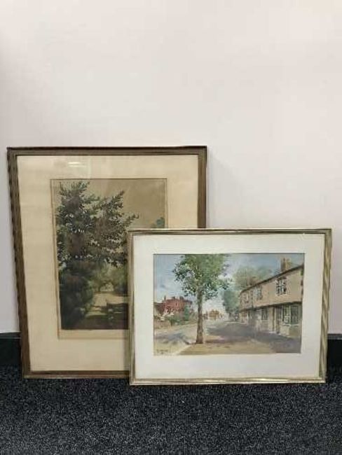 Twelves assorted pictures and prints - E. Warner watercolour dated 1946, signed lithographic print, boats at low tide, Churchill etc