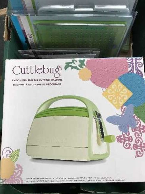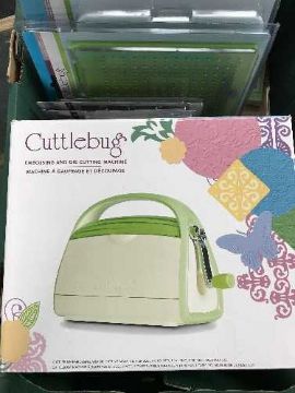 A box of Cuttlebug embossing and die cutting machine with accessories