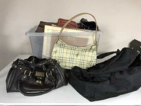 A box of assorted lady's leather hand bags, men's foot wear etc