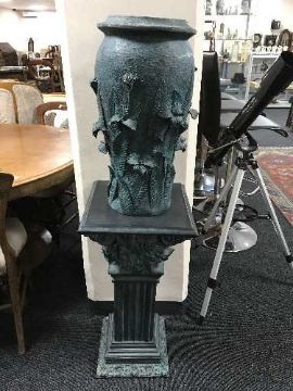 A turquoise jardiniere on stand