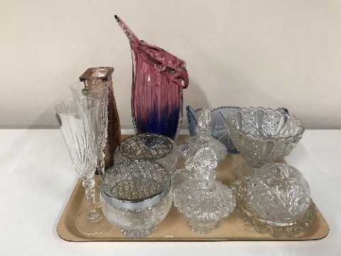 A tray of three mid 20th century coloured glass decanters with stoppers, lead crystal glasses, rose bowls, Whitefriars style vase etc