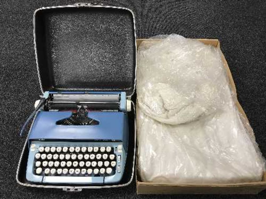 A Smith Corona sterling typewriter and a vintage wedding dress in box