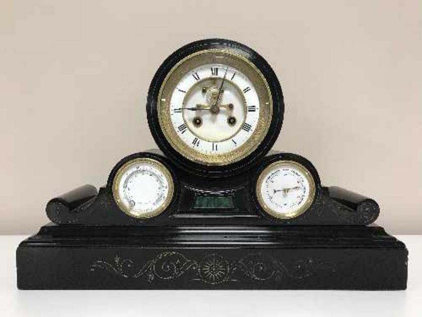 A Victorian black slate mantel clock with enamelled dial thermometer & barometer apertures