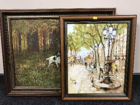 A framed oil painting of a gun dog, together with an oil depicting a Parisian street scene. (2)