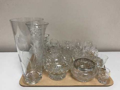 A tray of assorted drinking glasses, glass vases, rose bowl etc