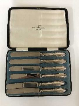 A set of six cased silver handled butter knives