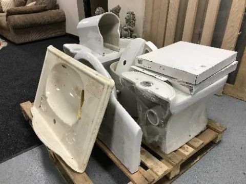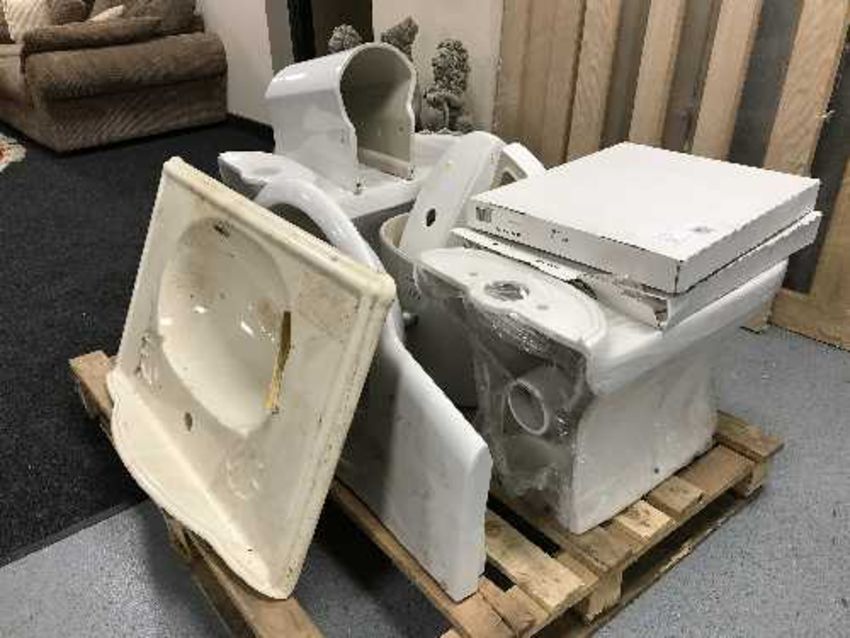 A pallet of two toilets, cisterns and seats, two wall mounted hand basins