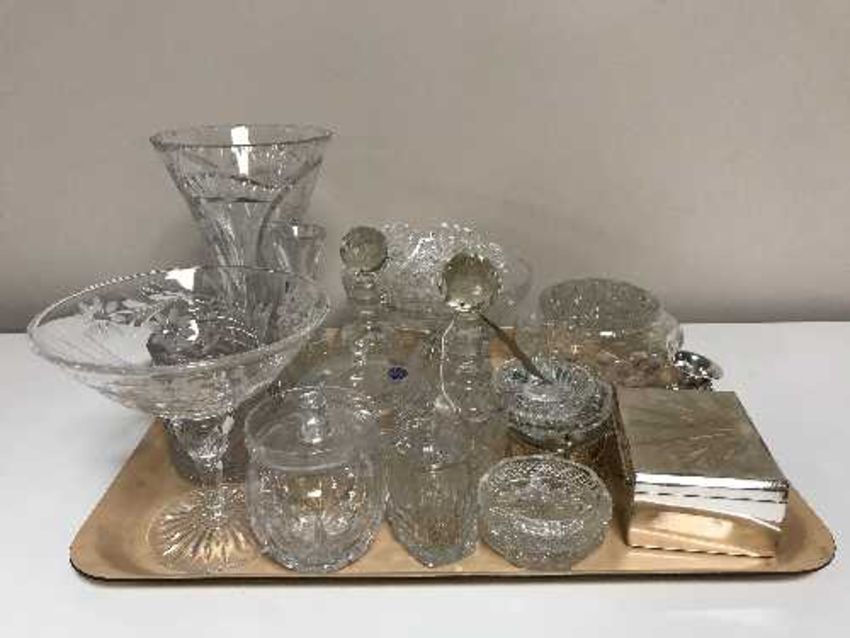 A tray of assorted lead crystal glass ware, comports, preserve pots, rose bowls etc