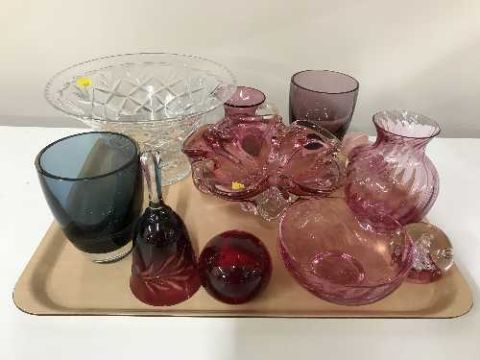 A tray of assorted cranberry and ruby glass ware, glass fruit bowl, paperweights etc