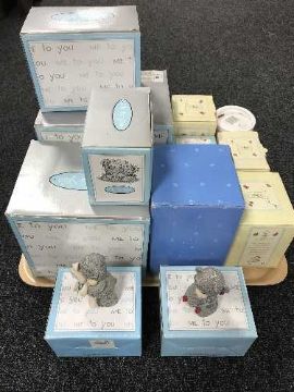 A tray of boxed Me to You teddy bears, Swarvoski crystal dog, three boxed Royal Doulton Whinney with Pooh figures