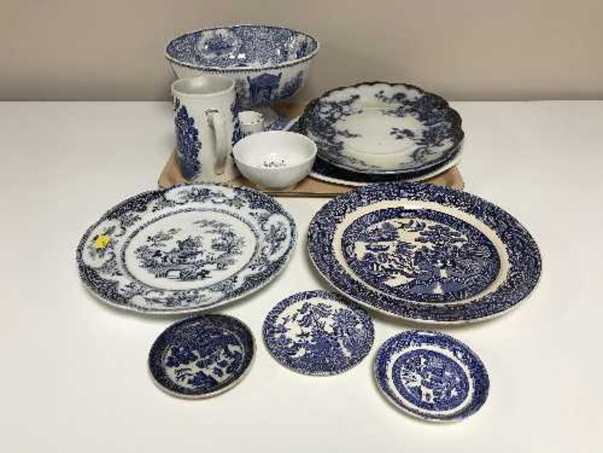 A tray of assorted late 19th century and 20th century blue and white china inc. dinner plates, serving plates, milk jug, bowl, Willow Pattern, Peking etc