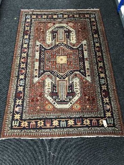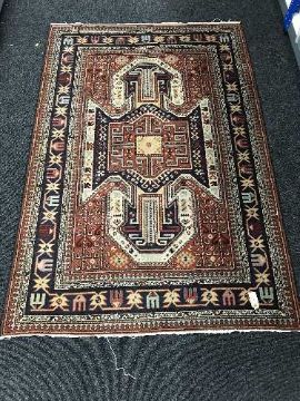 A fringed woolen Eastern rug on red ground and two table lamps