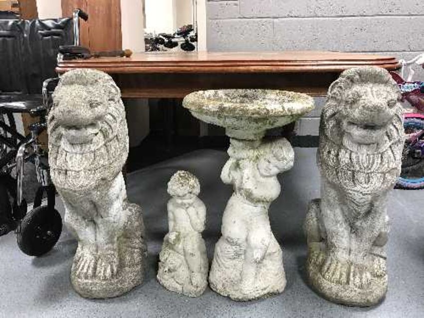 A pair of stone garden lions, stone bird bath and cherub ornament