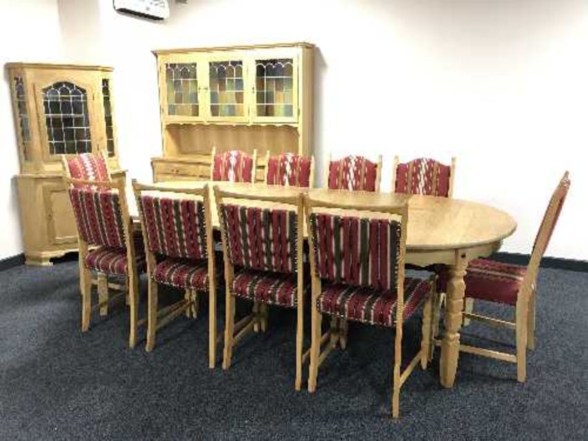 A circular blonde oak dining table with two leaves and six chairs and set of four chairs