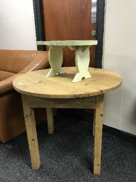 A rustic pine table and a small painted stool