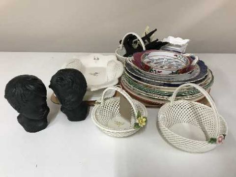 A tray of assorted plates and plate stands, three china baskets, Royal Albert Horizons serving plate, pair of busts etc