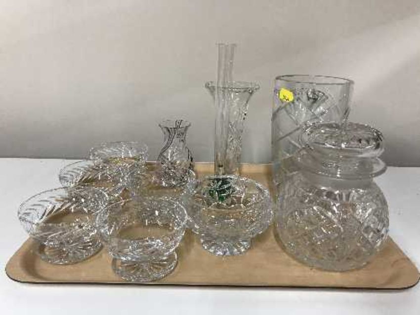 A tray of five Webb Crystal bowls, crystal storage jar, vases etc