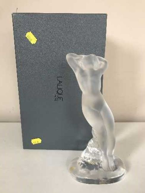A Lalique frosted glass nude female figure, 'Danseuse Bras Leves' (originally by Marc Lalique 1960), modelled as female nude standing with arms stretched above head leaning to one side leaning against naturalistic rocks on oval plinth, engraved Lalique France to base, height 23cm