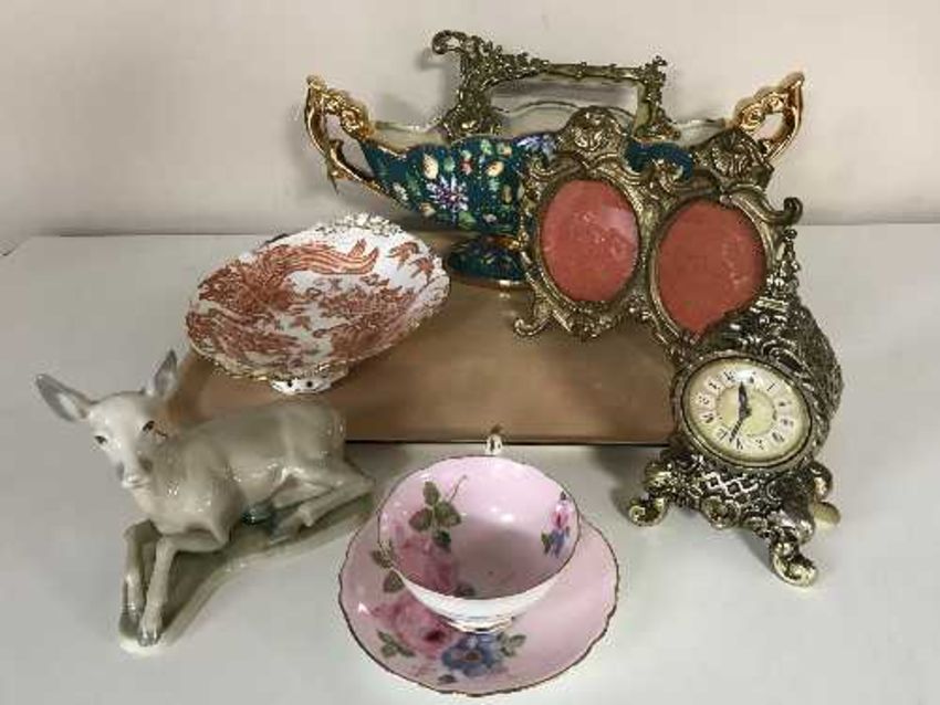 A tray of Royal Crown Derby Red Aves dish, Paragon bone china cup and saucer, metal picture frames, decorative twin handled planter, etc